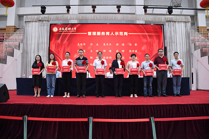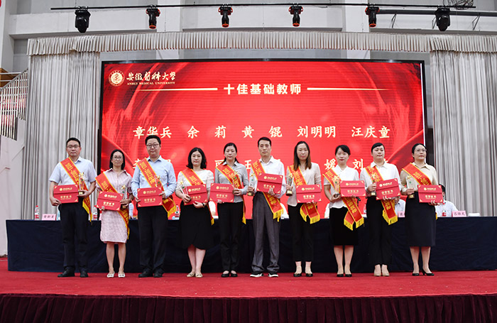 工作满35年在职教职工、卫生管理学院院长陶芳标教授,校“十佳基础教师”、基础医学院余莉教授,校“十佳临床教师”、第一临床医学院(第一附属医院)主任医师李小虎分别作为教师代表发言。基础医学院谢芬芬副教授带领新进教职工面向国旗庄严宣誓。