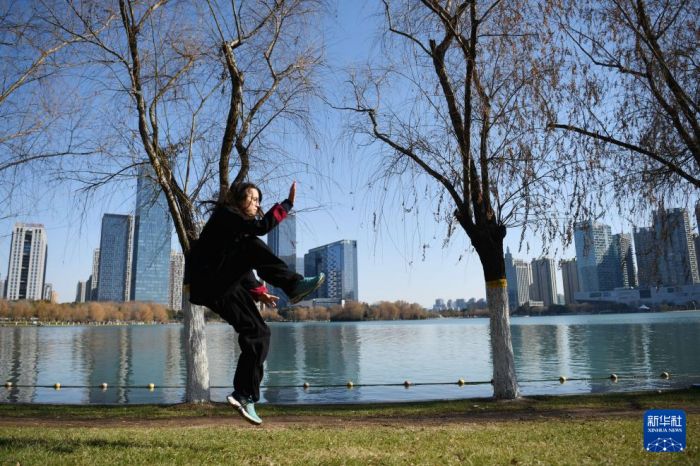 1月23日,章伯涵在安徽省合肥市天鹅湖畔练习太极拳。新华社记者 张端 摄