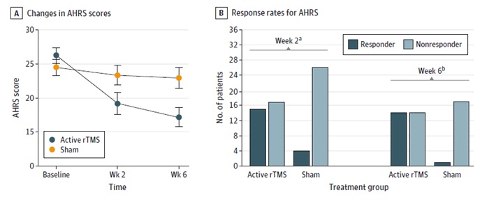该项目共招募了66例具有言语性幻听症状的精神分裂症患者(平均年龄27.39±8.97岁,男31例,女35例),并将其随机分配到治疗组和安慰剂组。在完成基线评估后,所有患者接受为期2周的rTMS干预。随后,测评人员在干预结束时和一个月后再次对患者进行临床症状测评。