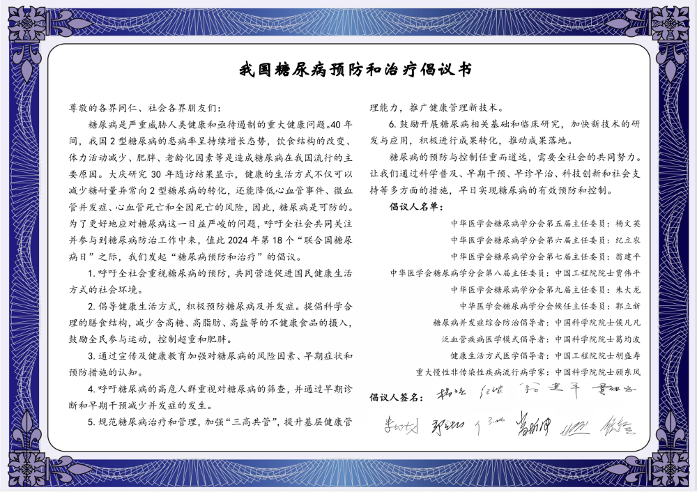 今年联合国糖尿病日的主题是“糖尿病与幸福感”。中华医学会糖尿病学分会历任主任委员杨文英、纪立农、翁建平、贾伟平、朱大龙以及多位中国科学院、中国工程院院士联合发起《我国糖尿病预防和治疗倡议书》。