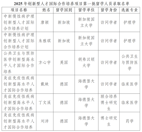 4月25日,国家留学基金管理委员会正式发布2025年创新型人才国际合作培养项目第一批留学人员录取名单。根据2025年创新型人才国际合作培养项目实施办法,经国家留学基金管理委员会审核,我校唐颖、朱雅琪、方心宇、戴映、丁文溪、刘沛等六名申请人均顺利获得录取资格。