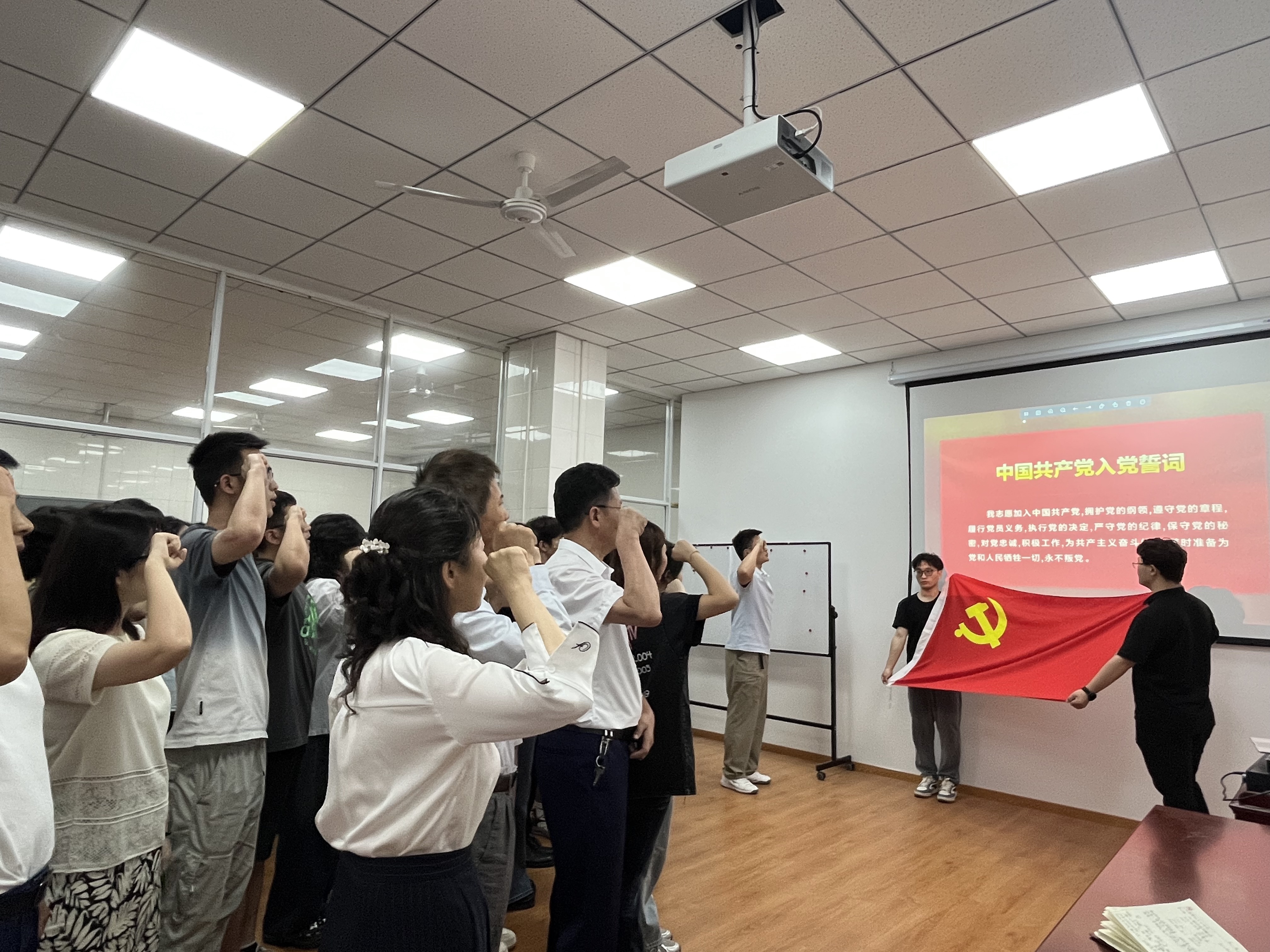 活动中,新党员在领誓人带领下,面向党旗,紧握右拳,庄严宣誓。誓词字字千钧,表达了他们对党的无限忠诚和为共产主义奋斗终身的坚定信念。老党员一同重温入党誓词,再次接受思想洗礼和精神淬炼,进一步筑牢信仰之基。