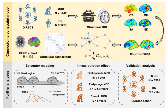 基于多中心的中国抑郁症成像研究协会(the DIRECT consortium)数据,该项研究共纳入1442名MDD患者与1277名健康对照,通过组间分析得到了MDD患者稳定可靠的皮层形态学改变空间分布模式。同时基于中国人脑连接组计划(CHCP)数据集获得了高质量的健康人群脑连接组数据。研究利用最新的连接组限制模型,来验证MDD患者皮层形态学改变是否遵循大脑白质连接架构,并辅以网络扩散模型寻找结构改变发生的震中(epicenter)脑区。